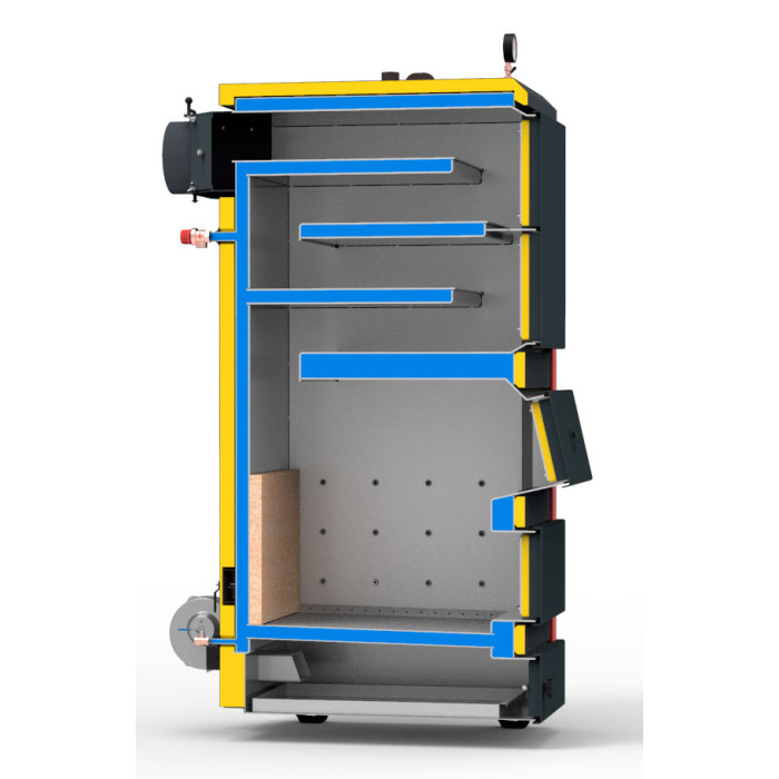 Система первинного та вторинного розподілення повітря дає можливість працювати котлу після щільного закриття всіх дверок та лючків згідно заданих на контролері параметрів роботи. Роль обслуговуючого персоналу заключається тільки в своєчасному поповненні камери згорання паливом.
