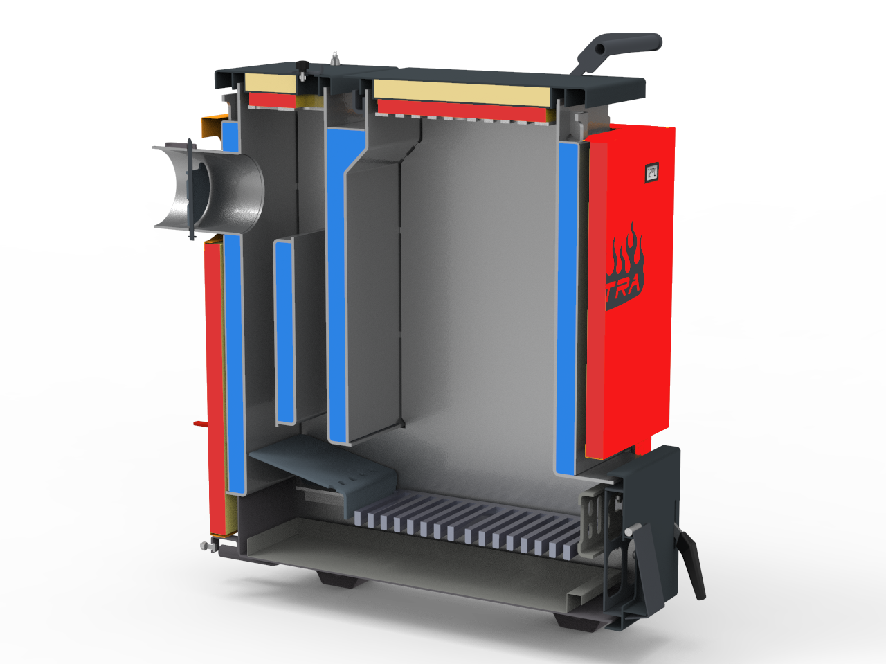 - Стінки та газоходи виготовлені з високоякісної котлової сталі товщиною 3 або 4 мм та охолоджуються водою.