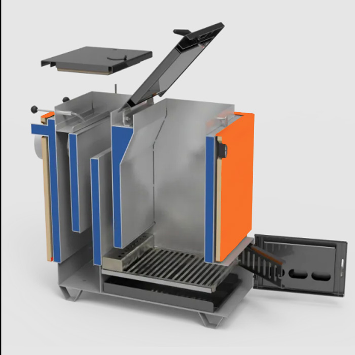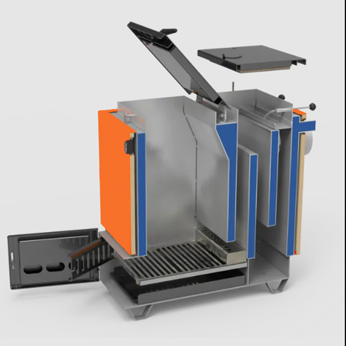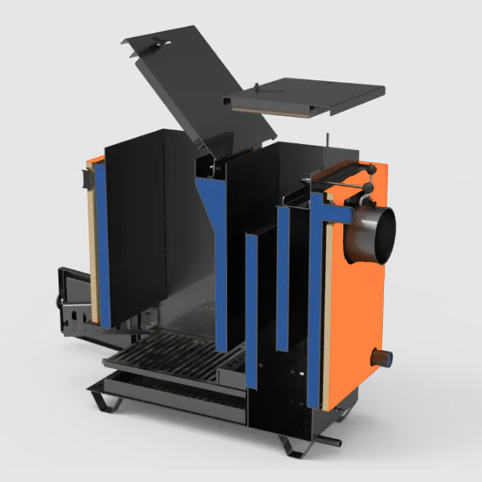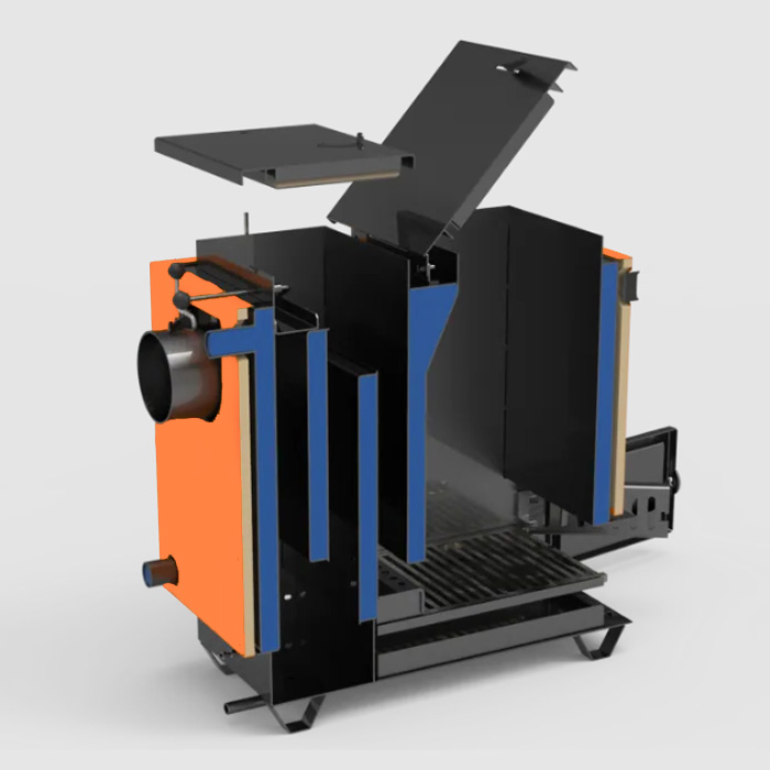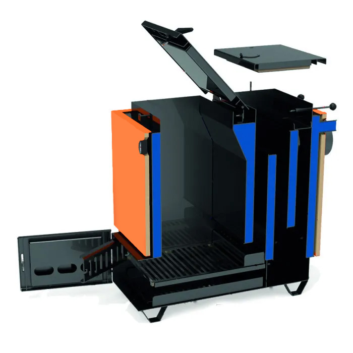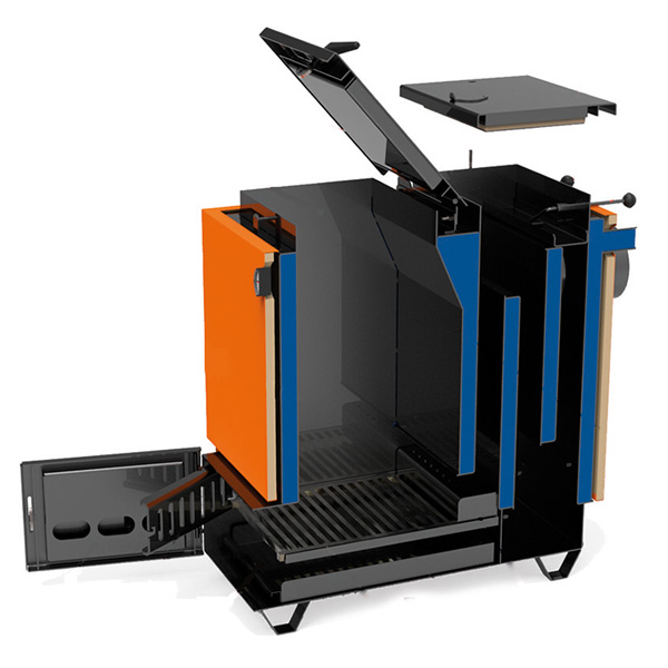 - Стінки та газоходи виготовлені з високоякісної котлової сталі товщиною 3 або 4 мм та охолоджуються водою.