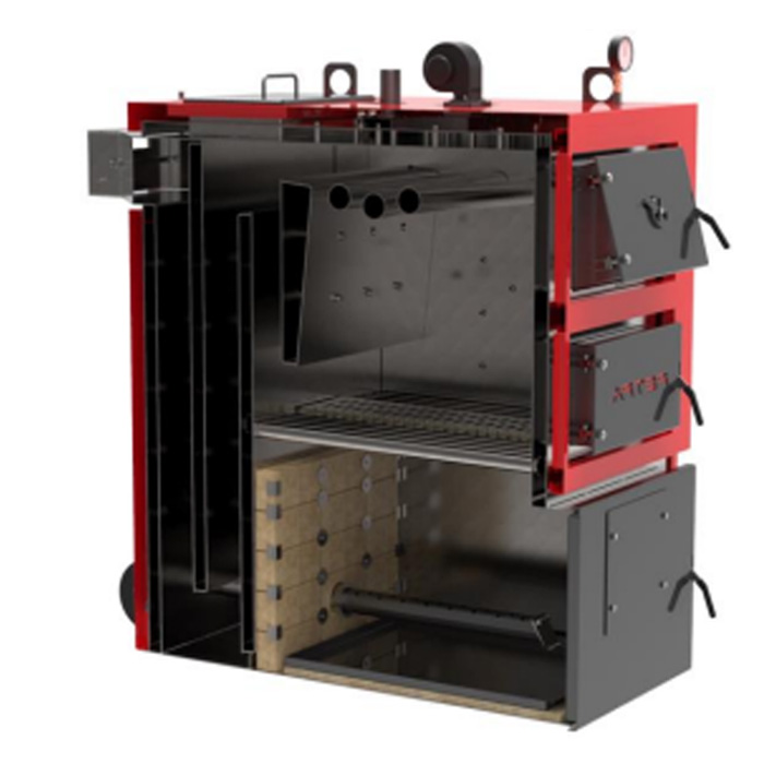 - Конструкція котла дозволяє спалювати різні види палива (пелети, вугілля, дерево, брикети, тирса, відходи деревини).