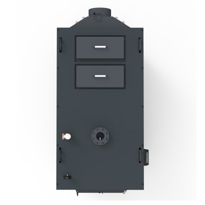 1. стальний теплообмінник 2. перегородка пряма 3. димохід з шибером 4. розсікач первинного повітря 5. фланець вентилятора 6. форсунки вторинного повітря 7. зольний ящик 8. люк завантажувальний 9. люк вигрібний 10. люк видалення попелу 11. люк для чистки димових каналів 12. пульт керування 13. патрубок подачі 14. патрубок звороту 15. патрубок зливу конденсату 16. решітка колосникова 17. патрубок зливу з шаровим краном 18. клапан запобіжний (дод. опція) 19. футерування топки (дод. опція) 20. факельний пальник (дод. опція) 21. бункер (дод. опція)